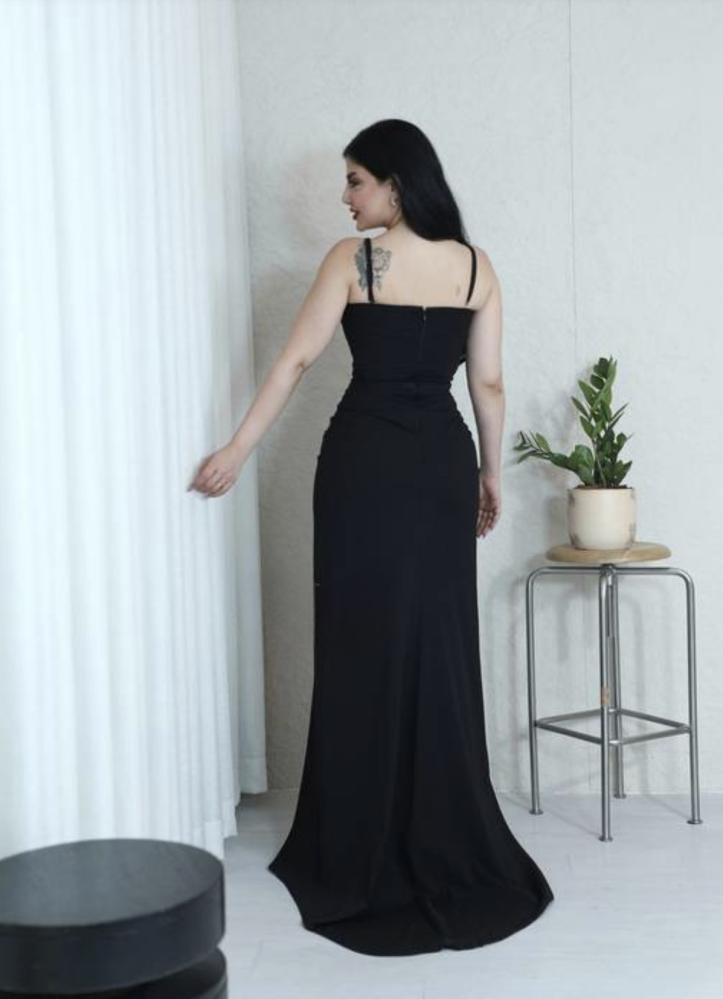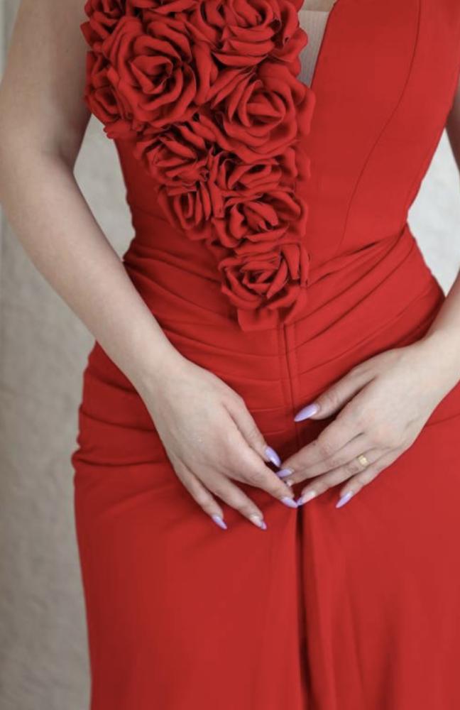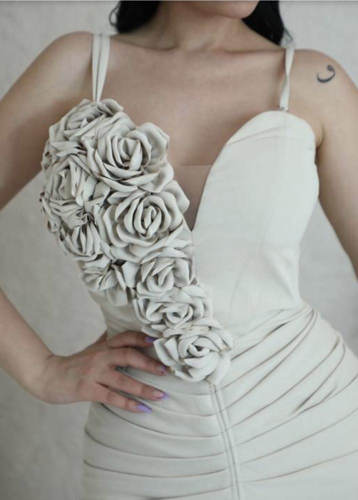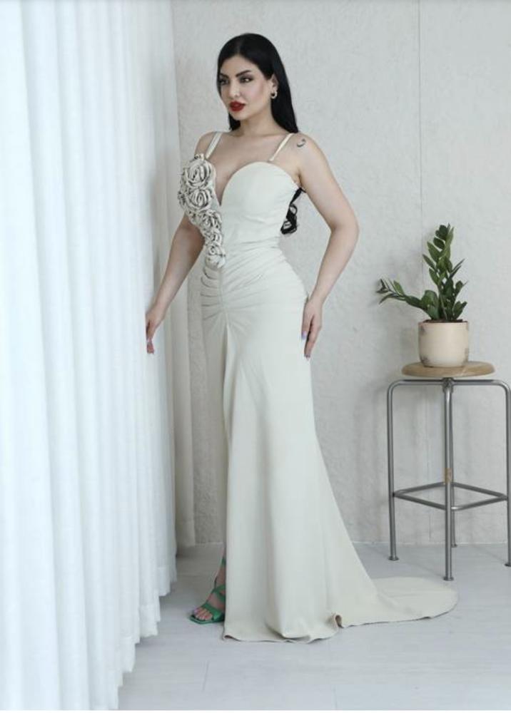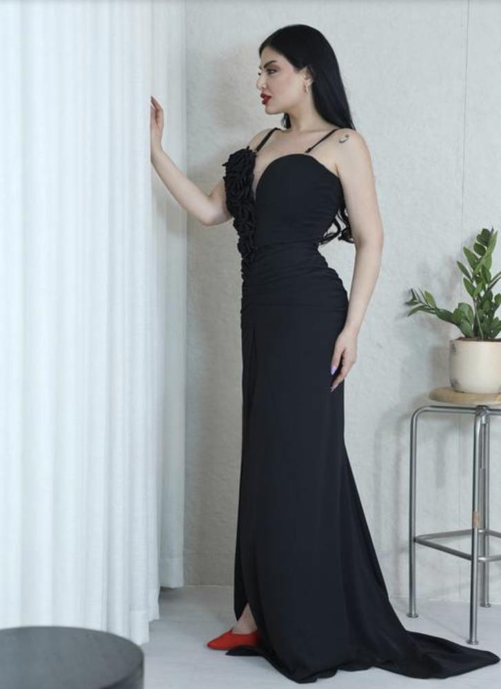 فستان سهرة طويل بقصة ورود على الصدر انيقة وفخمة لا تترددي في طلبه